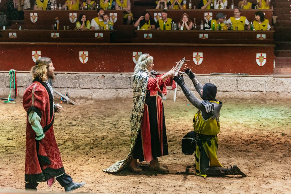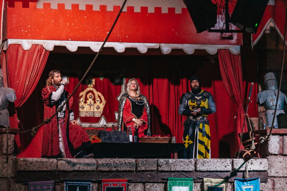 Notre château est situé dans le sud de Tenerife et son infrastructure est conçue pour que vous viviez une aventure médiévale dès que vous franchissez ses murs majestueux. Le Castillo San Miguel de Tenerife est une construction de 6 000 mètres carrés, réalisée en pierre de canto, typique des îles Canaries. Dès que vous entrez dans le château, vous vous rendez compte que vous êtes dans un monde médiéval authentique. Le comte Don Rodrigo et sa fille la jeune comtesse vous accueilleront et vous souhaiteront la bienvenue dans leur château, dont l’entrée est décorée d’armures, d’épées, de coffres et d’écrits de l’époque. Les aimables sujets du comte Don Rodrigo vous accompagneront jusqu’à la Sala de los Torneos, où un spectacle de combats, de tournois et de jeux médiévaux se déroulera en présence des comtes. Pendant le tournoi, le banquet sera servi. Le Castillo San Miguel vous propose un menu dont vous pourrez profiter au maximum pendant le banquet, au milieu des joutes. Le menu se compose d’une crème de légumes de saison avec des cubes de fromage, d’un poulet garrot au four dans son jus avec des pommes de terre au four et des tomates assaisonnées, d’un gâteau à la crème glacée avec du sirop de chocolat. Le vin rouge et blanc, l’eau minérale et le jus d’orange sont inclus pendant le dîner. Si vous souhaitez assister au spectacle au premier rang, choisissez l’option VIP. Vous serez également invité à boire un verre de cava avec ce billet.